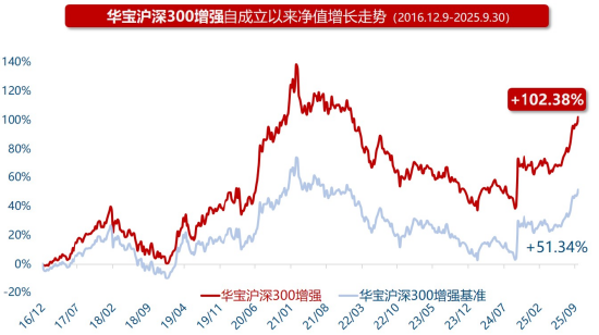 同样由王正、徐林明两位基金经理共同管理的华宝沪深300增强基金,自2016年12月成立以来已运作了近9年时间,历经牛熊考验,展现出强劲的长期超额收益实力。2025年基金三季报显示,自基金成立至2025年9月30日,华宝沪深300增强基金(003876)净值增长102.38%,超额达51.04%,净值增长超出业绩基准近一倍。在2017-2024年的8个年度中,华宝沪深300增强基金(003876)共有7个年度实现了超额回报。