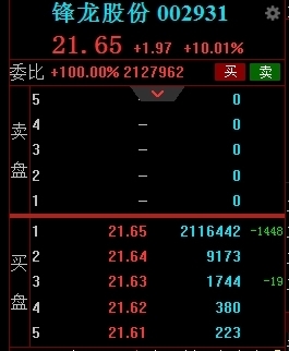 午后截至发稿,锋龙股份涨停板上的封单依然超过2.16亿股,若以21.65元/股计算,在锋龙股份涨停板上排队资金超过46亿元,而锋龙股份流通市值也才43.43亿元。