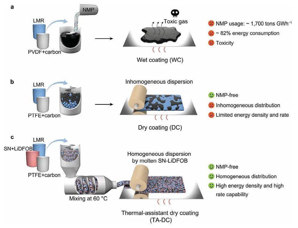 在湿法涂层电极制备中使用大量N-甲基-2-吡咯烷酮(NMP),这不仅增加了材料成本,并且NMP的毒性和易燃性还引起了严重的健康和安全问题。为了解决这一问题,干法涂层(DC)方法已经引起了学术界和工业界的广泛兴趣。然而,迄今为止,对于高能量密度的锂和锰富集正极(LMR, Li1.2Mn0.54i0.13Co0.13O2)的干涂层仍然具有挑战性。