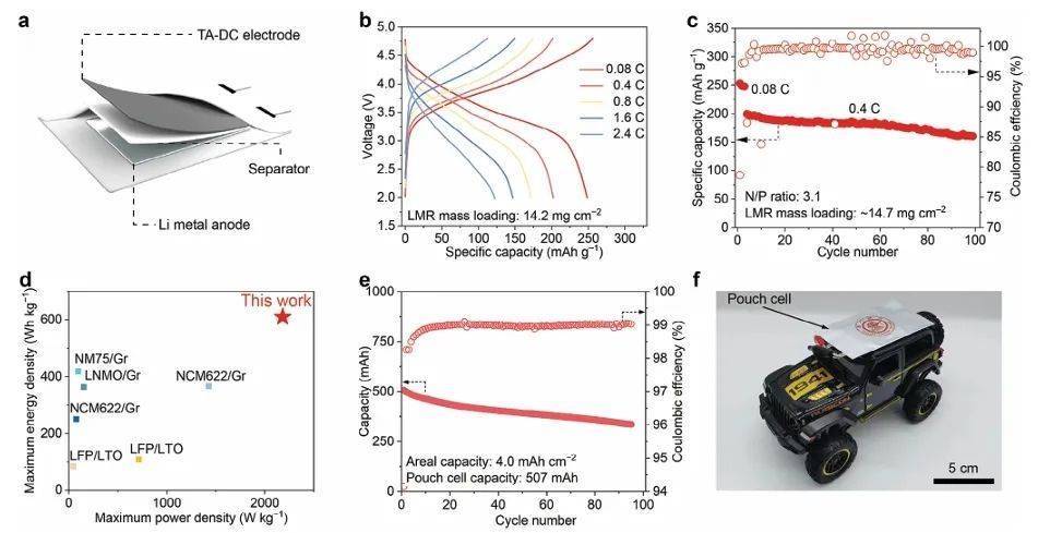 图2. 基于TA-DC电极的Li金属/LMR全电池