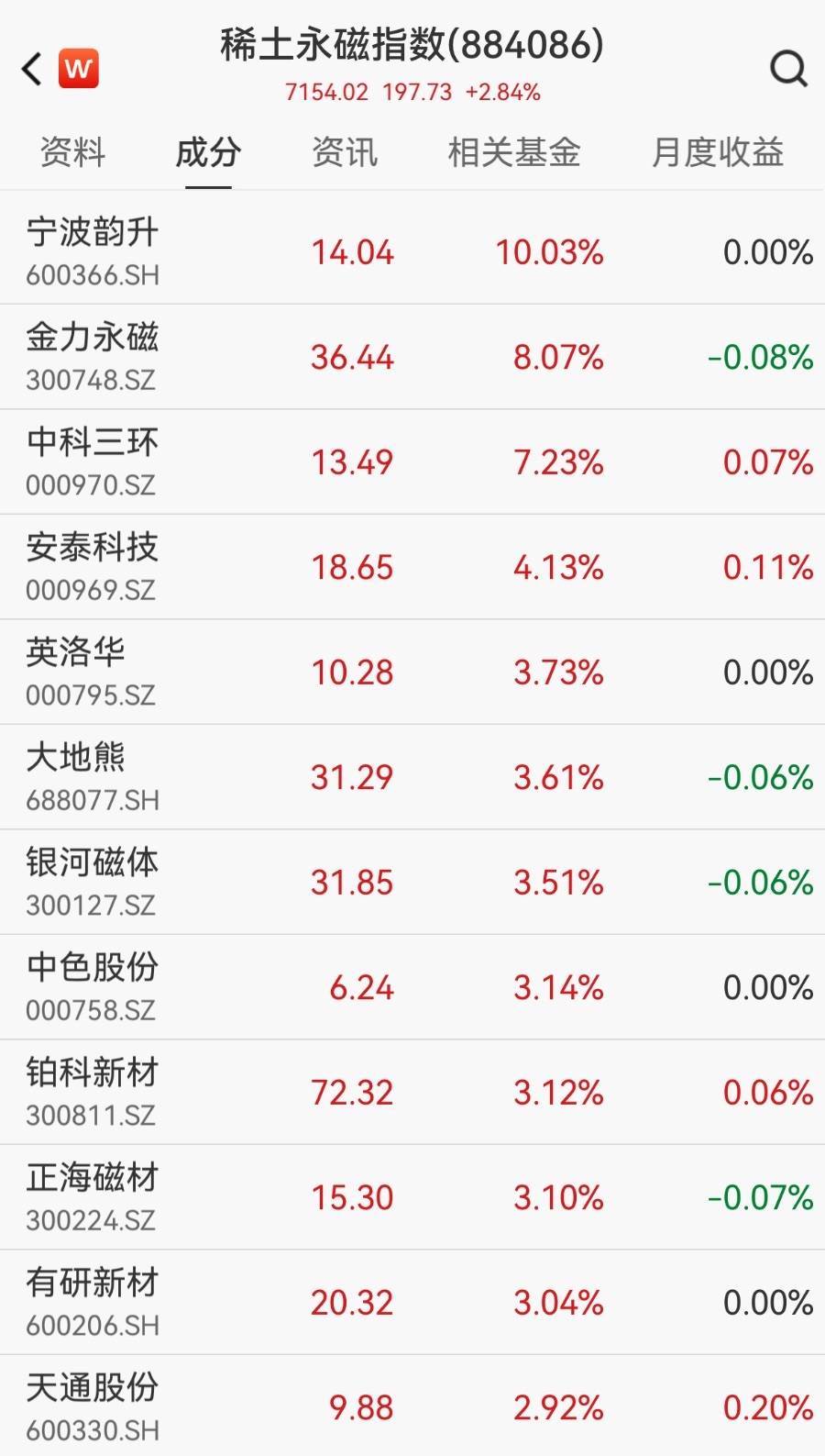 12月5日,稀土永磁板块尾盘突然走高,宁波韵升(600366.SH)涨停,金力永磁(300748.SZ)、中科三环(000970.SZ)涨超5%跟涨。