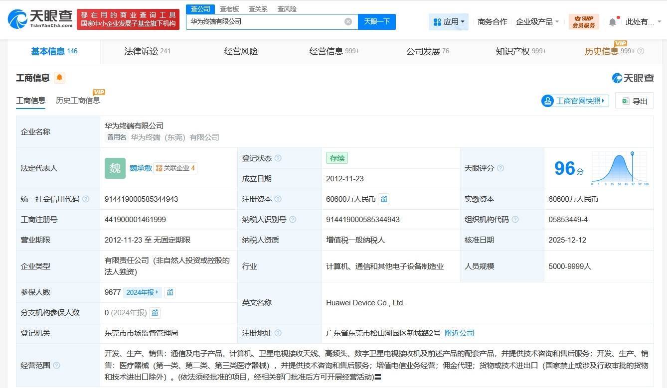 华为终端有限公司成立于2012年11月,法定代表人为魏承敏,注册资本6.06亿人民币。股东信息显示,该公司由华为终端(深圳)有限公司全资持股。
