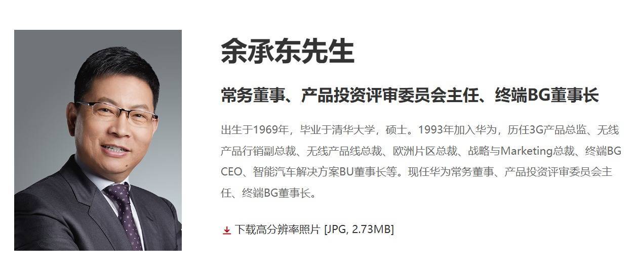 华为官网显示,余承东出生于1969年,毕业于清华大学,硕士。1993年加入华为,历任3G产品总监、无线产品行销副总裁、无线产品线总裁、欧洲片区总裁、战略与Marketing总裁、终端BG CEO、智能汽车解决方案BU董事长等。现任华为常务董事、产品投资评审委员会主任、终端BG董事长。